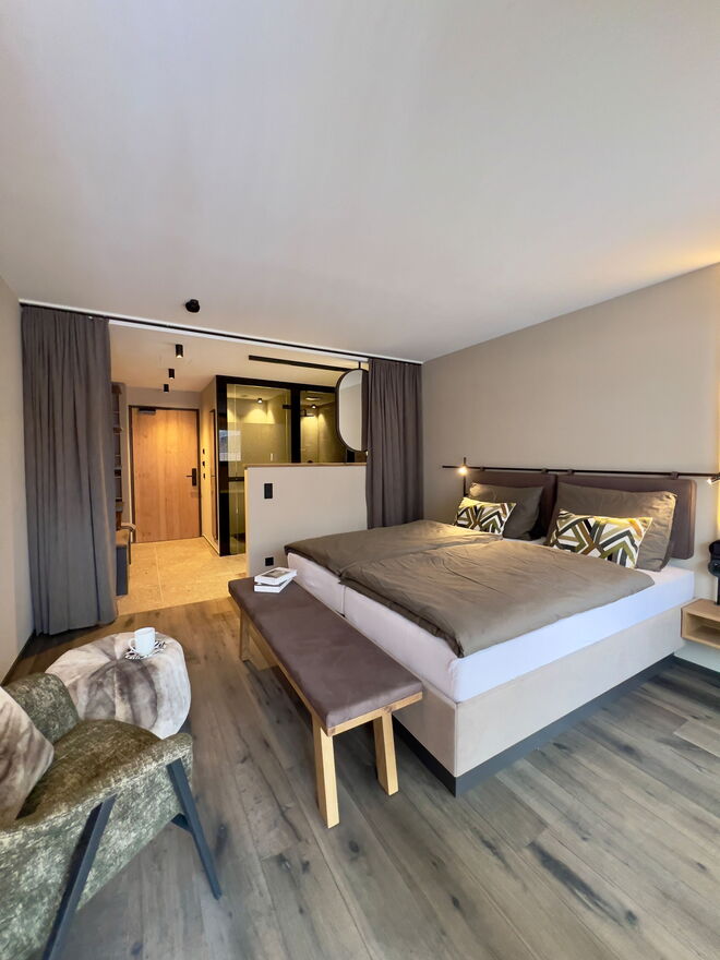 Le Kitzsteinhorn est plus qu'un sommet - c'est un symbole, un lieu de nostalgie et un compagnon silencieux à travers toutes les saisons. The Peak House est notre hommage à cette montagne majestueuse : le bâtiment principal élégant, dans lequel la clarté alpine rencontre un design accueillant. Avec des matériaux naturels, des tons chauds et de larges vues, les chambres invitent à l'arrivée - soit avec vue sur notre jardin au soleil couchant, soit en direction du Kitzsteinhorn lui-même. Ici, on ne vit pas seulement à Kaprun - on fait partie du décor.